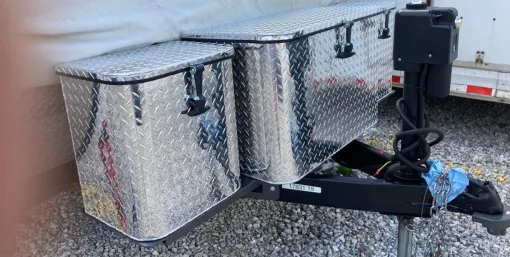 Are you looking for a replacement of the ABS/plastic box from the manufacturer? Is it cracked? Want something with a solid and sturdy bottom? Need extra storage? Sea Biscuit Metal Designs has the solution! We have hand crafted a heavy duty 31″ center box – Fits Little Guy Max, Little Guy Max FX, Little Guy Mini Max, Micro Max and Shadow. Measures: 31″ Wide x 20″ front to back x 19.5″ high (reaching into box). This box will hold (2) propane tanks, battery box and still have room to spare! Vented properly, 100% aluminum constructed, fully welded. Water resistant. LP/Battery storage bracket included. Solid and sturdy bottom with accessory holes for the electric disconnect and regulator access. Continuous stainless steel hinge. Hardware kit included. Rubber hasp closure.