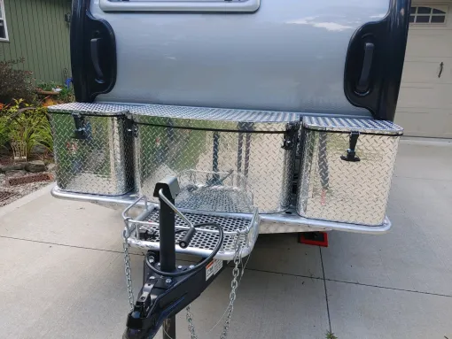 Are you needing a convenient place to store your electric cords, chock blocks, miscellaneous tools, sewer hose and whatever else you carry when camping in your nuCamp TAB 320 or TAB 400? Need to make your camping breakdown routine much easier? Want to have a uniform aluminum diamond plate look across the front of your nuCamp TAB 320 or TAB 400? Sea Biscuit Metal Designs has the storage solution you are looking for!! Closes with a rubber hasp that matches your current center box. These boxes are handcrafted from high quality aluminum diamond plate, fully welded and virtually watertight. Our nuCamp TAB XL box measures – 17 ½”w x 18” high x 12 ¾” front to back. They fit both the TAB 400 and TAB 320. All mounting hardware included. Easy to install – only takes a few minutes. See the installation video on the product page when ordering.